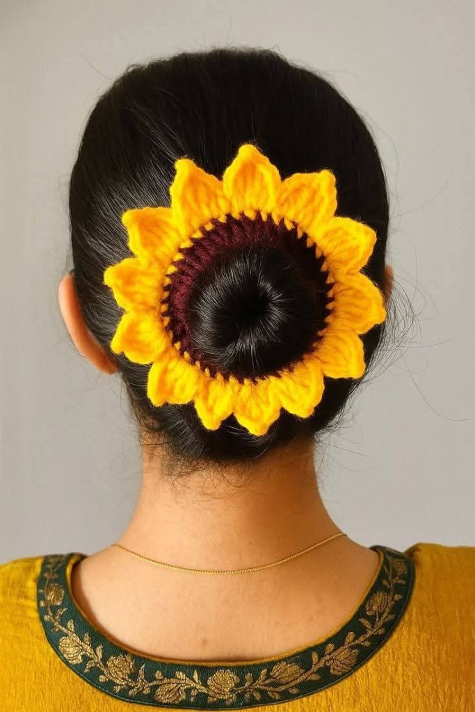 Yarn texture can also change the appearance of the finished scrunchie. Cotton yarn produces a smooth and crisp design, while fluffy or velvet yarn creates a softer and more luxurious accessory. Each yarn type adds a different character to the Crochet Sunflower Scrunchie Pattern.