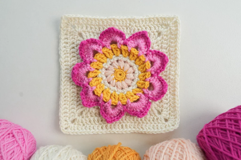 Blocking is essential for this pattern. After finishing your square, gently block it to enhance the petal shape and flatten the edges. Use a steam or wet-blocking method, depending on your yarn fiber.